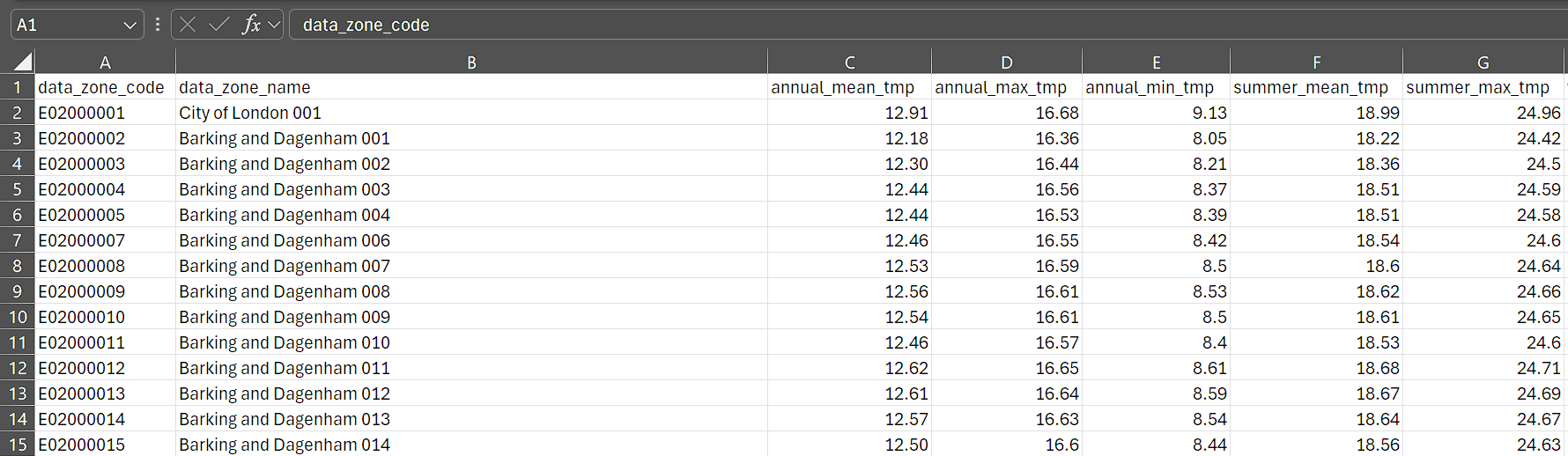 Open the product file (e.g., Heat, Pollution, SPF at LSOA level).