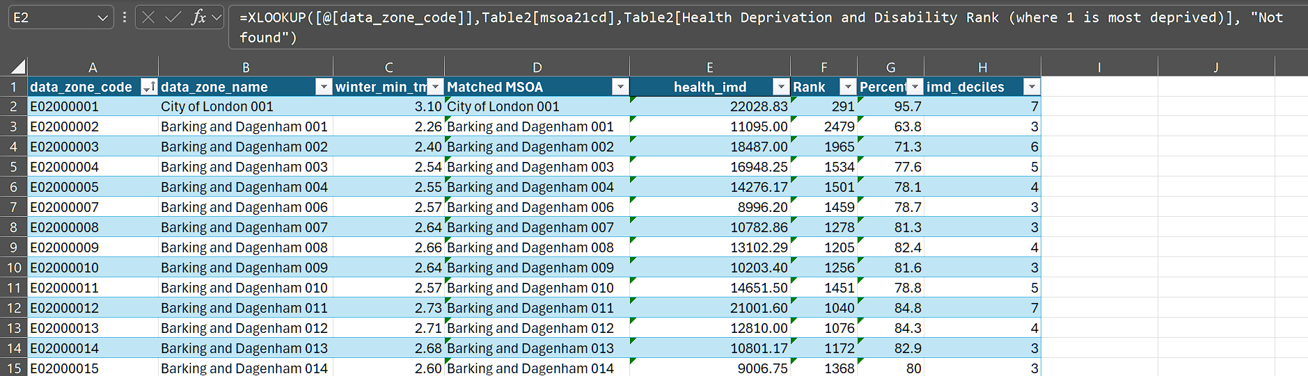 =XLOOKUP([@[data_zone_code]],Table2[msoa21cd],Table2[Health Deprivation and Disability Rank (where 1 is most deprived)], "Not found")
