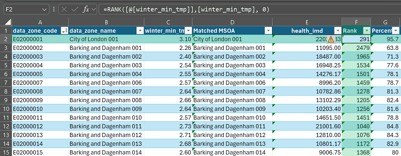 Cross-reference with deprivation: Join other IMD variables and examine whether temperature extremes fall disproportionately on more deprived communities.