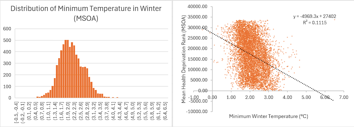 A simple correlation (=CORREL(Table1[winter_min_tmp],Table1[health_imd])) shows the correlation between the two is 0.23.