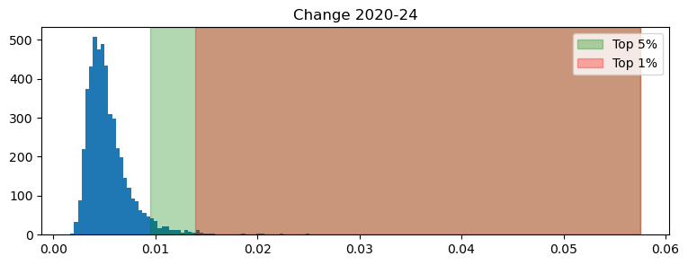 Note how heavily skewed the distribution is. This has a direct interpretation in meaningful terms: while most areas have not experienced much change, a few (particularly the top 1%), has seen significant differences recorded in the embedding numbers.