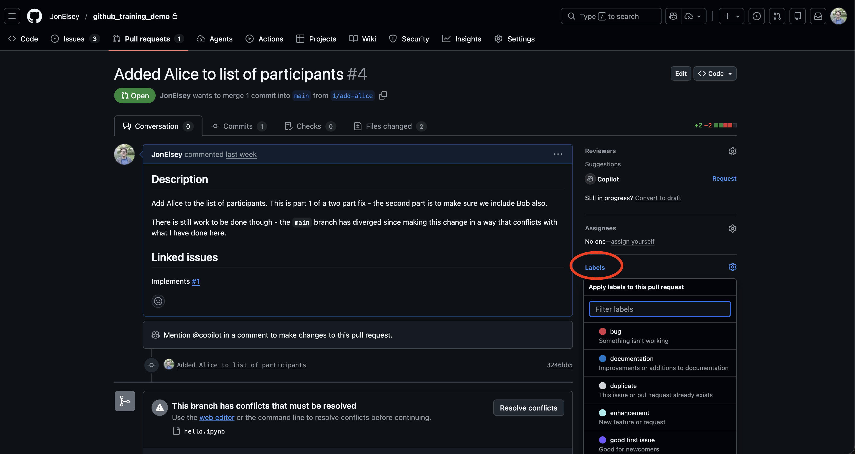 Labels are a useful way to categorise whatever problem it is you are working on. For example, a PR with the bug keyword might be a high priority for a team member to look at and therefore contribute to, or refactor might indicate that the core functionality of your code should stay the same, directing the reviewer to focus on testing whether that is the case.